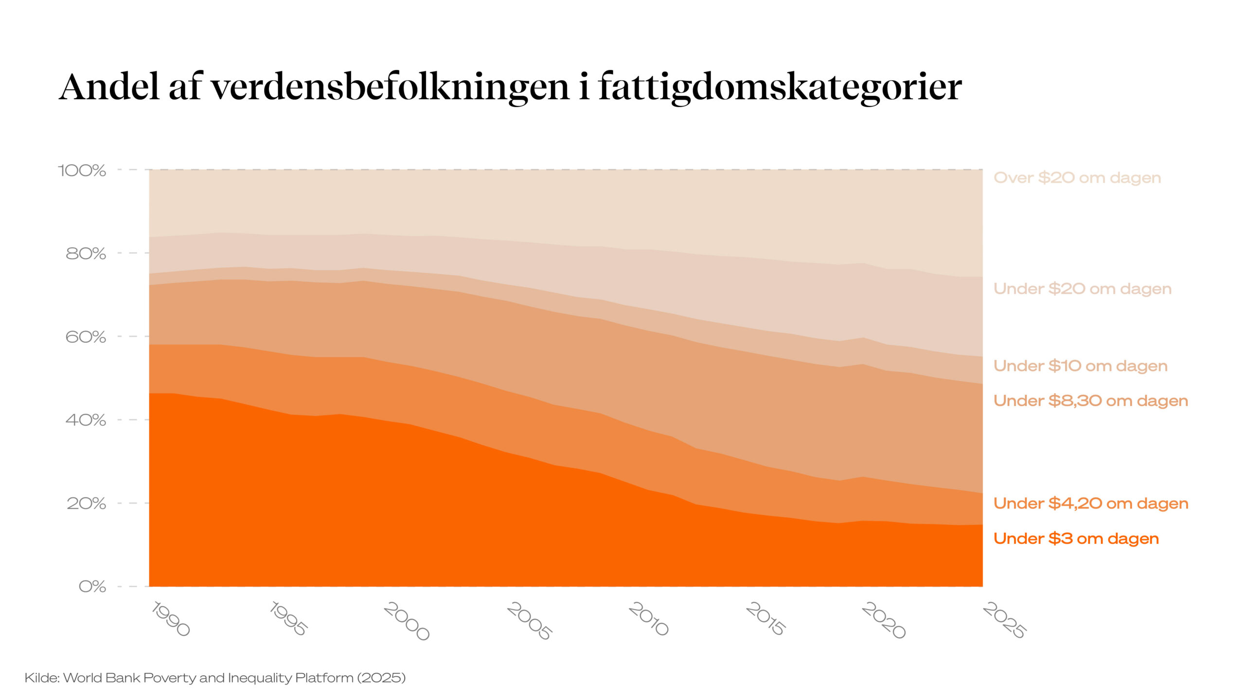 Bare inden for de sidste 35 år er den ekstreme fattigdom raslet ned. I 1990 levede flere end fire ud af ti mennesker på jordkloden for under 3 dollars om dagen. Nu er det én ud af ti – et fald på 75 procent. Og det er ikke kun den mest ekstreme fattigdom, der er faldet, men også de andre typer fattigdom. Det betyder også, at der har været kæmpestore fremskridt i alt fra antallet af børn, der dør som spæd, over piger der nu kommer ind på skolebænken til rent drikkevand i hanen…