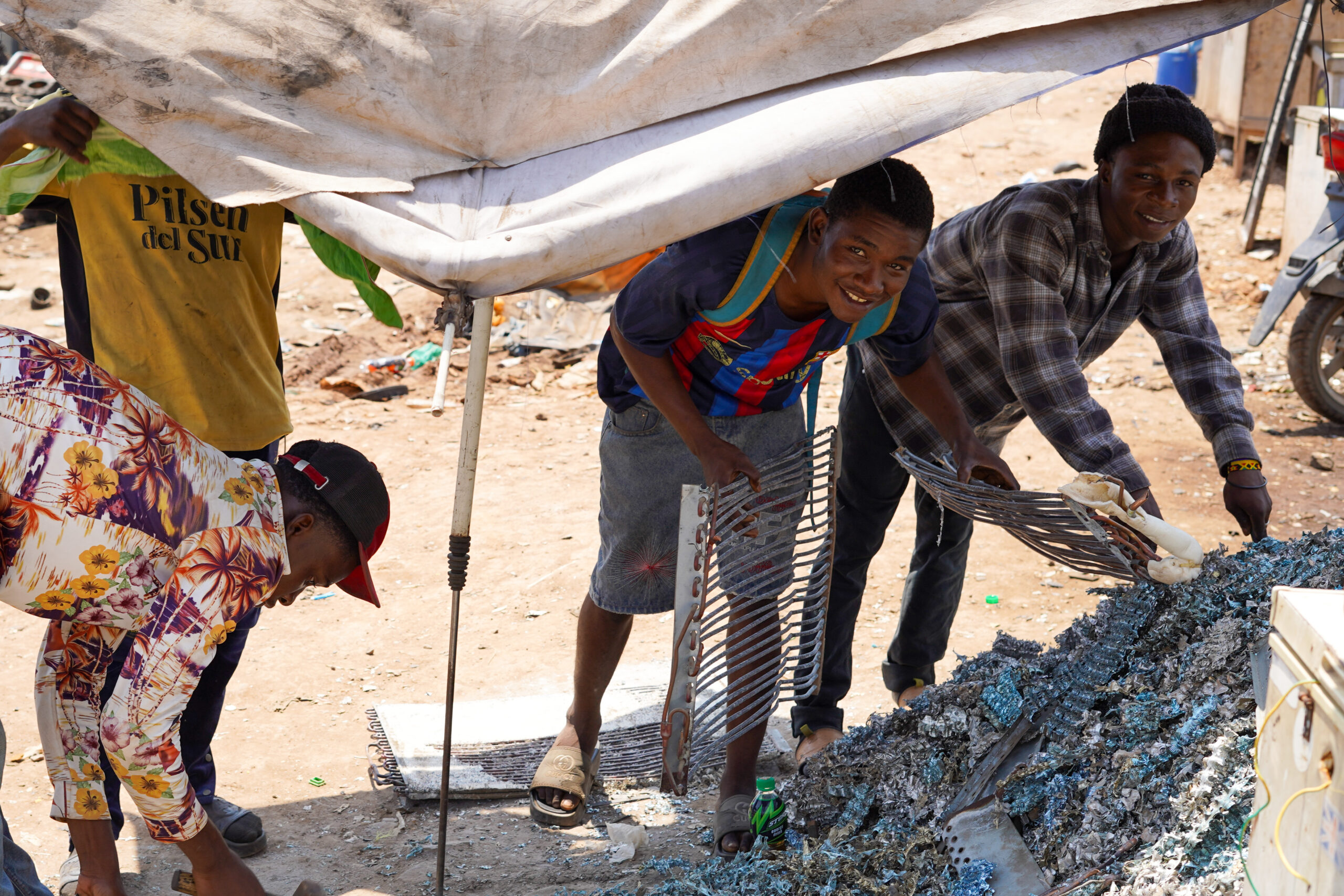 Ved siden står tre yngre drenge bøjet over jorden. Hurtigt trækker de runde magneter fra gamle højtalere over resterne af metal og plastik fra de mange apparater, der allerede er blevet skilt ad. Magneterne tiltrækker de sidste små dele, som straks ryger op i den plasticpose, de holder i den anden hånd. Der er penge at tjene på selv de små dele. De går også til at spare op til deres skolegang, fortæller Abdulai Issah.