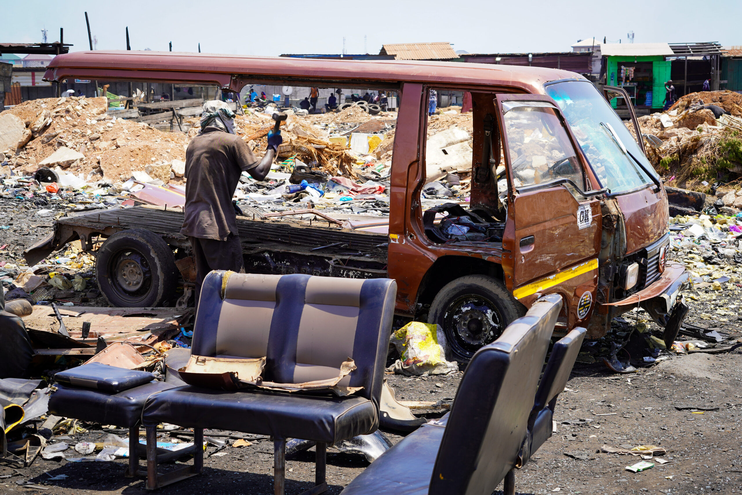 30 meter længere henne er endnu en mand i gang med at skille en trotro (lokal minibus) ad med taktfaste slag fra en hammer. Sæderne er allerede befriet og står nu og venter i den bagende sol.