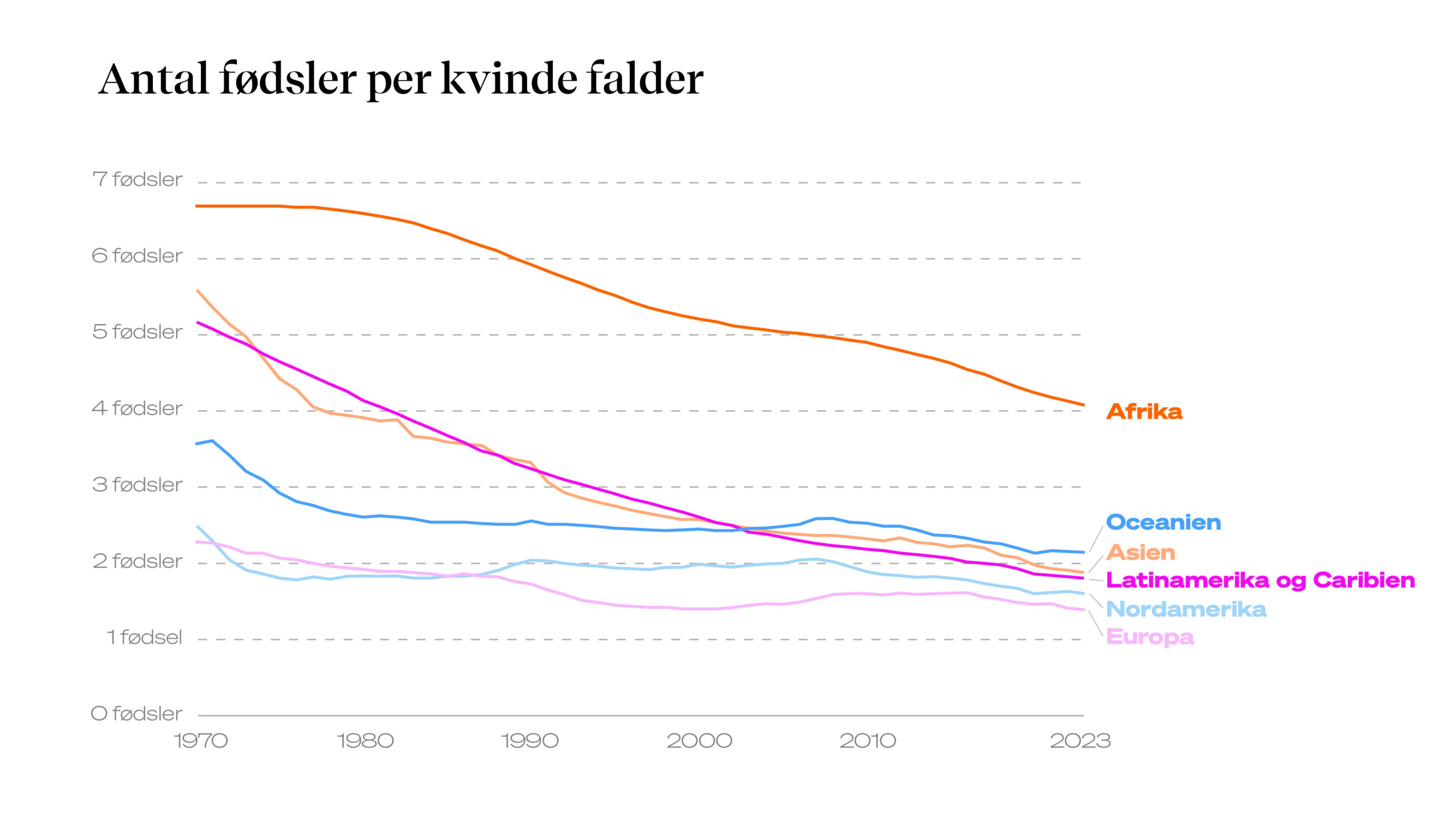 Som du kan se på grafen ovenfor, så er antallet af fødsler per kvinde faldet markant verden over de sidste 50 år. Kilde: Human Fertility Database og UN World Population Prospects. Infografik: Eva Søe Olsen