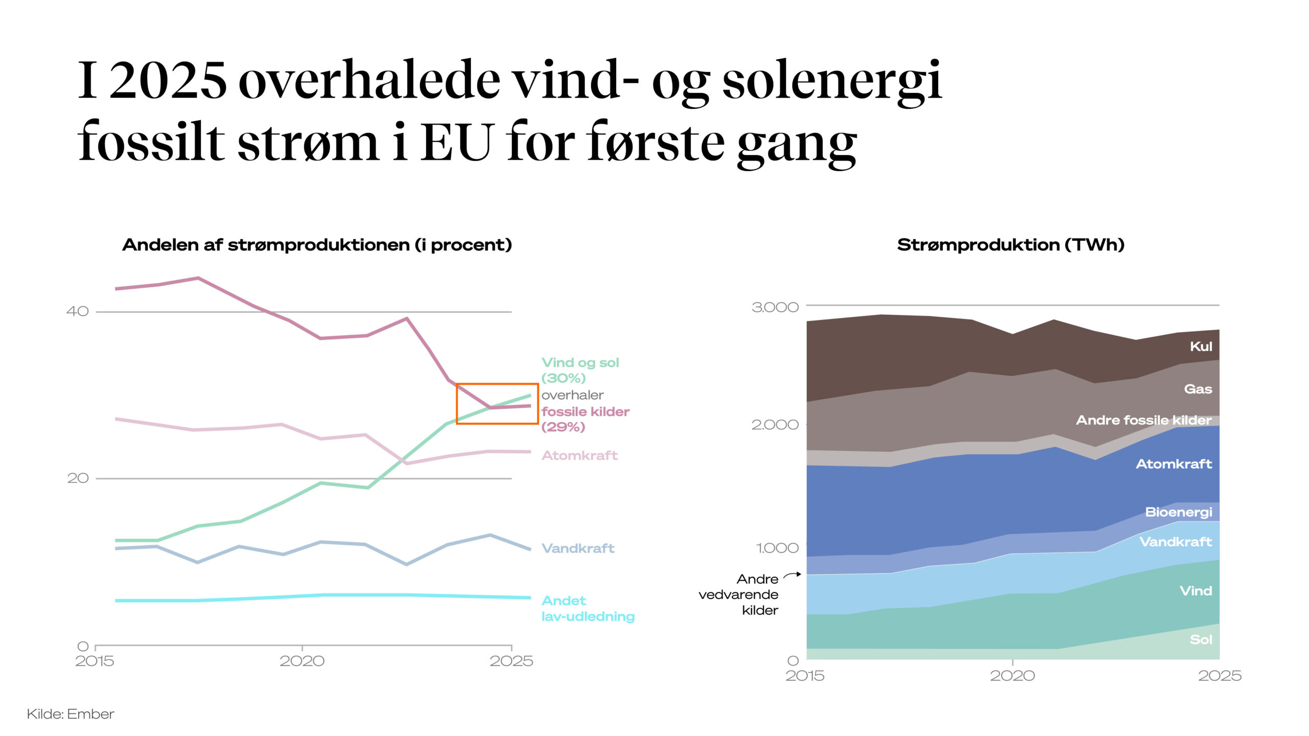 Vindkraft og solstrøm producerede 30 procent af strømmen i hele EU igennem 2025, mens kul, gas, olie og så videre tilsammen nåede 29 procent.