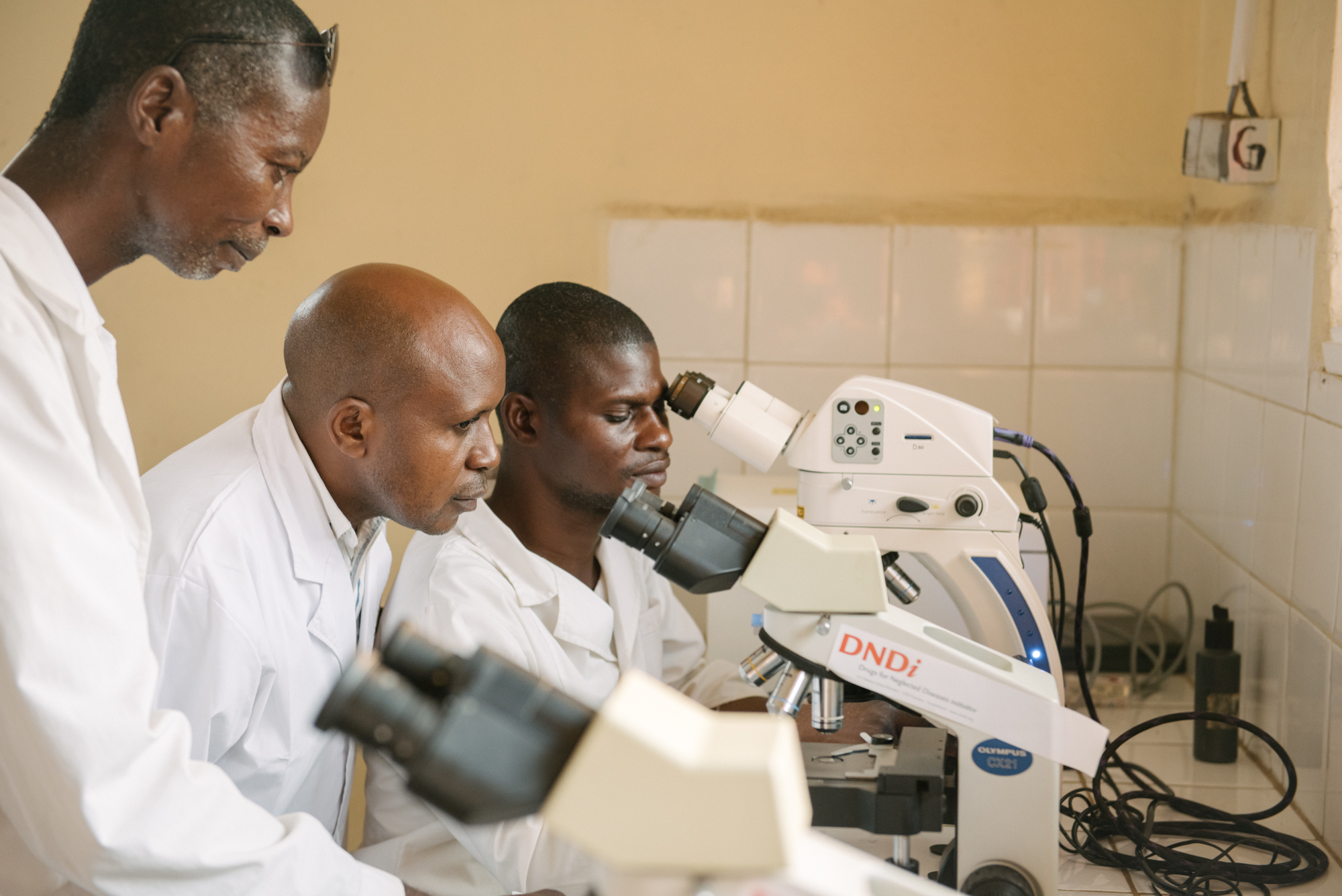 I DR Congo undersøger Dr. Willy Kuziena og hans team prøver for sovesyge. Med nye behandlingsmetoder behøver patienterne ikke længere komme på hospitalet, men kan behandles hjemme. Foto: Xavier Vahed/DNDi