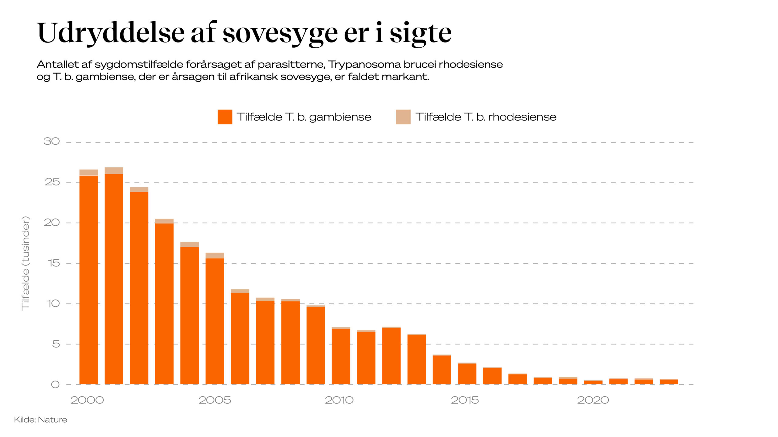 I dag er der under 600 nye tilfælde om året – over halvdelen af dem er i Den Demokratiske Republik Congo – og noget tyder på, at sygdommen snart kan være fortid på det afrikanske kontinent. Inden for de seneste fem år har en stribe lande som Chad, Guinea, Rwanda og Uganda nemlig udryddet afrikansk sovesyge.