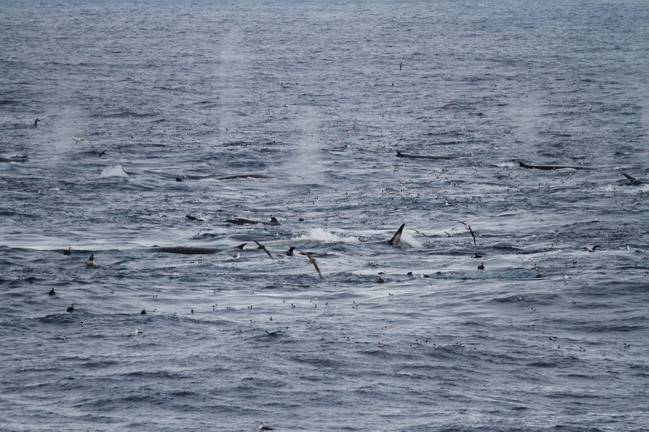 Finhvaler spiser krebsdyr set fra båden på hvalforsker Helena Herrs opdagelsesrejse. Foto: Sacha Viquerat