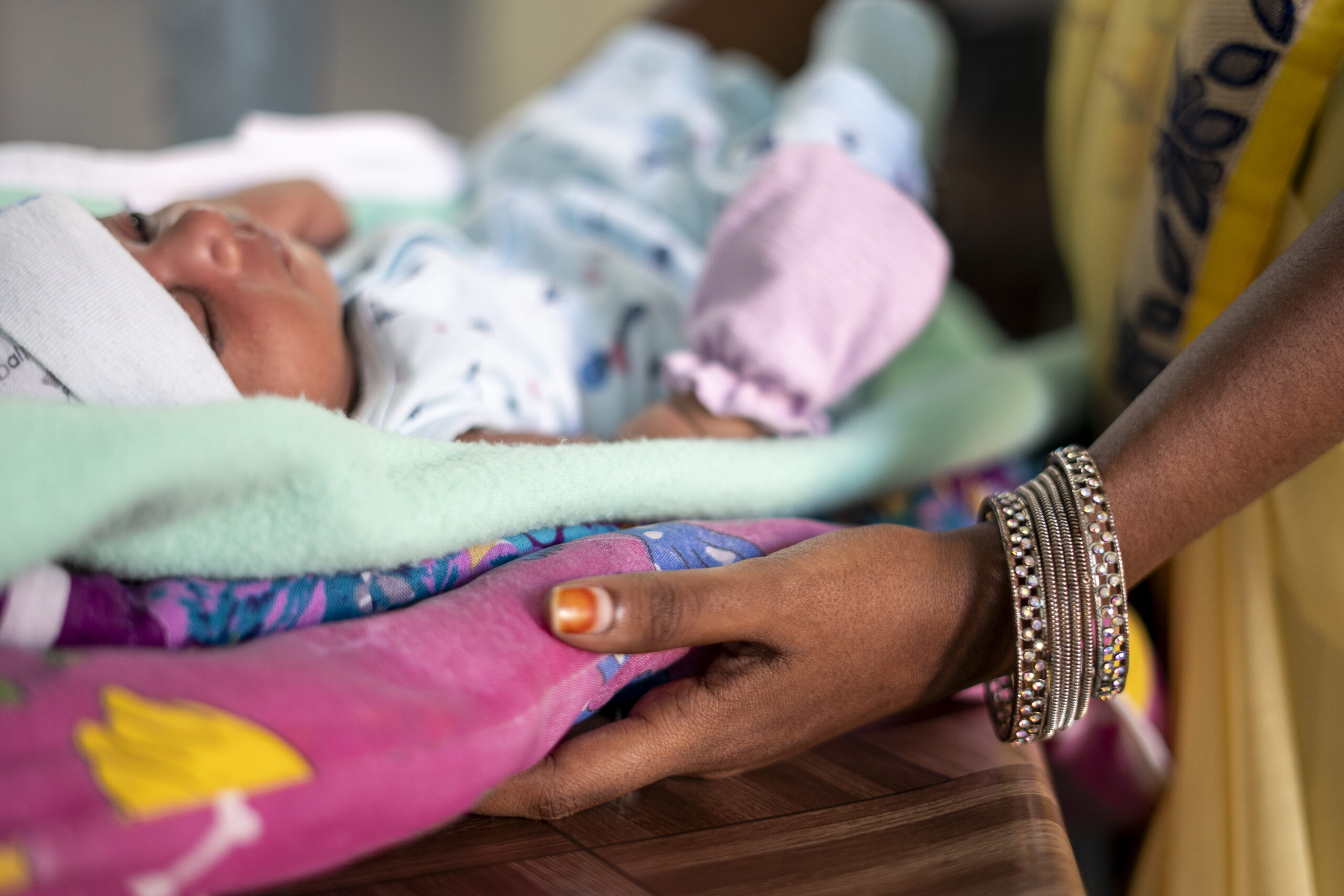 Sonali er hiv-positiv og har sit 3 uger gamle spædbarn med på sundhedscenteret i Kondapalli i Indien. Foto: UNICEF/Muthuramalingam