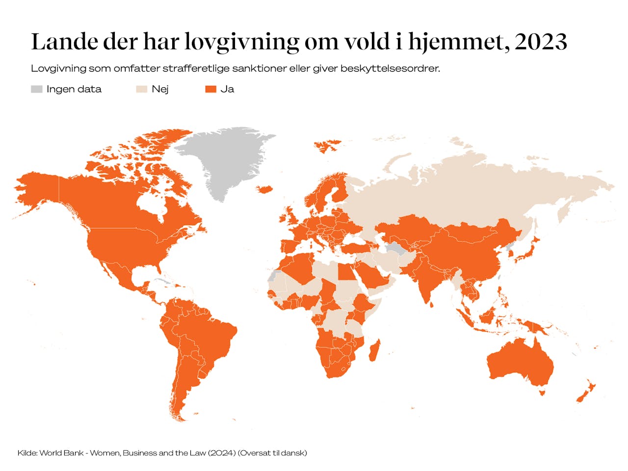 Men i dag ser billedet helt anderledes ud. For nu er ni ud af ti personer i hele verden beskyttet af en lov, der gør vold i hjemmet ulovligt, viser nye tal fra Verdensbanken.