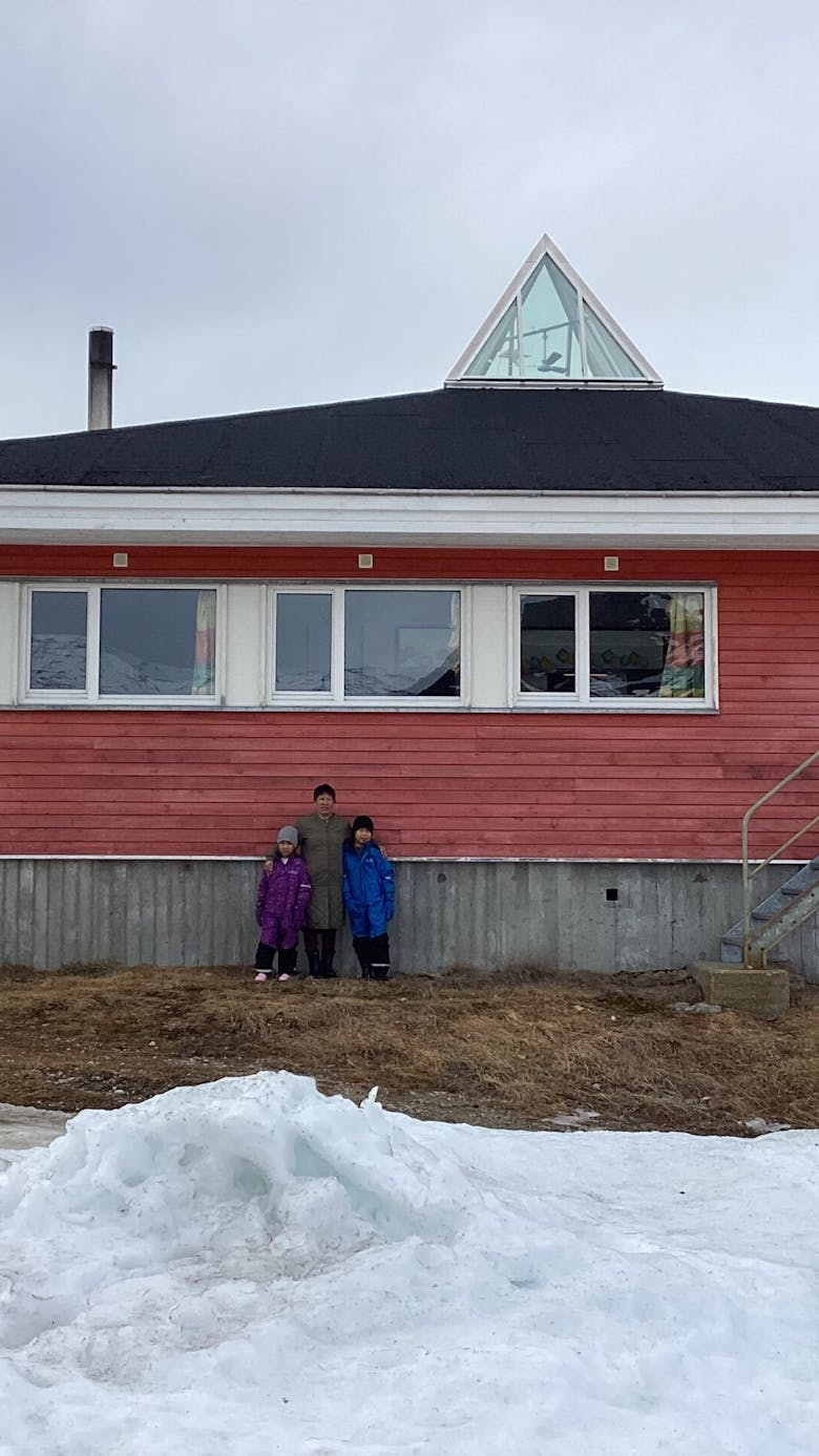 Bag katederet står deres klasselærer – eller lokallærer, som de kalder det her i bygden – Aaju Thorsteinsen. Hun har ingen læreruddannelse bag sig, og hun er alene om at undervise skolens eneste tre elever i alle skolefag. Det gælder både grønlandsk, samfundsfag, matematik, idræt, naturfag og dansk – et sprog som Aaju Thorsteinsen ikke selv taler flydende.