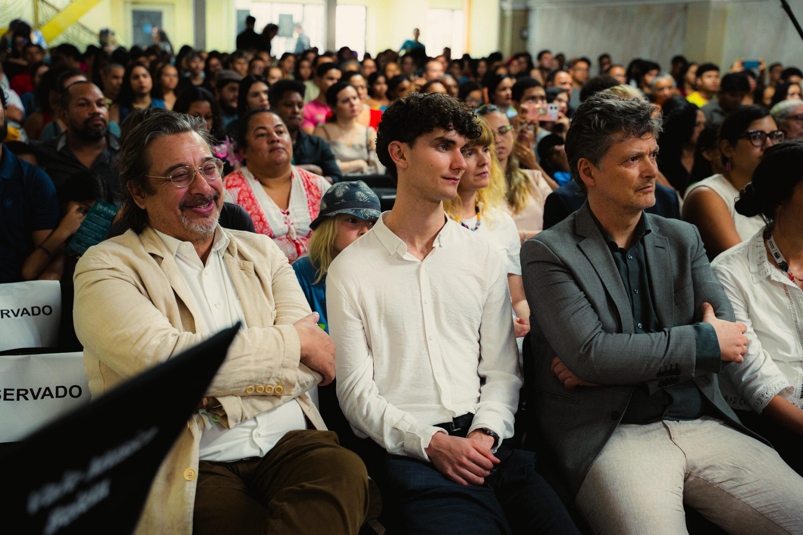 Udover over en sal fyldt med lokale brasilianere, deltog beslutningstagere fra Danmark til koncerten til COP30. Her ses Sigurd Krabbe (mf), der er FNs ungdomsdelegerede, og Anders Hentze (th) fra Instituto Pon, som begge banede vejen for, at Biofonia som afslutning på COP’en blev præsenteret på Denmark Pavillon med en talk på den Blå Zone hos State of Green. Foto: Atanásio/Gaynett/Ribeiro.