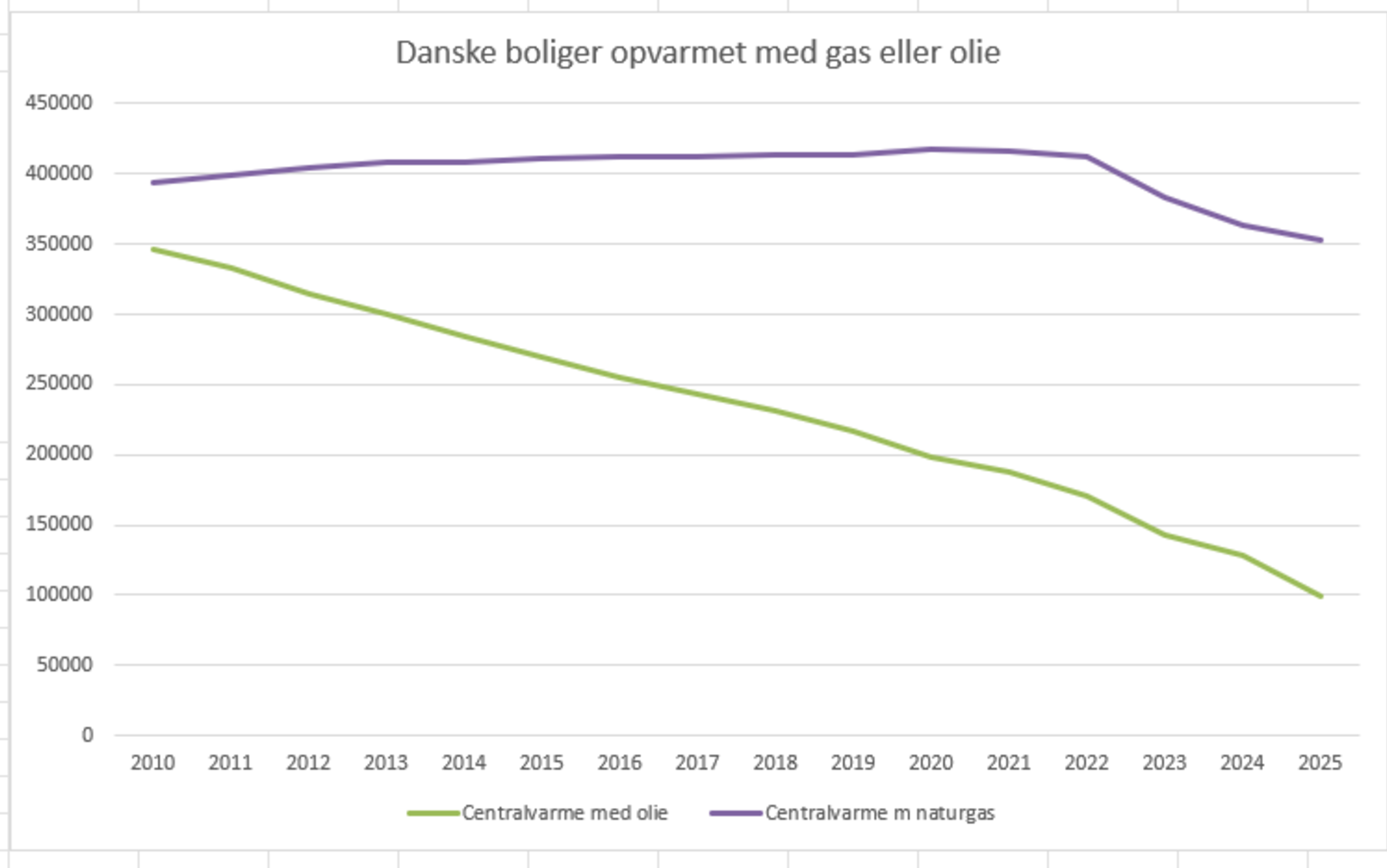 Efter en stigning helt frem mod 2020 er antallet af danske hjem, der varmer med gas, begyndt at falde med næsten samme hastighed, som antallet af hjem, der varmer med olie.