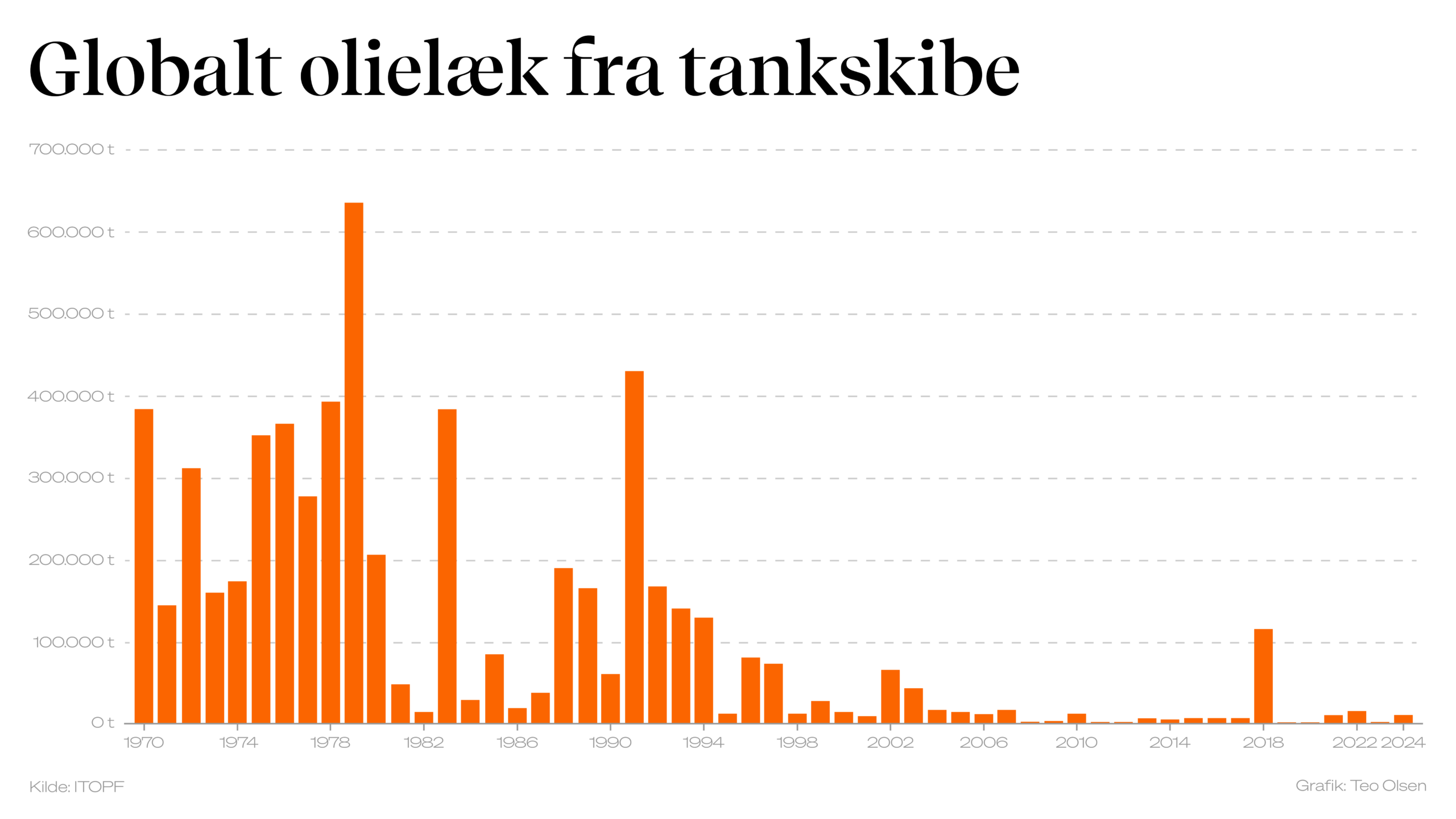 I årtiet 1970’erne blev der spildt over 300.000 tons olie fra tankskibe i alt. I det seneste årti, 2010’erne, var det faldet til 16.400 ton. Det viser tal fra ITOPF, et international forbund af tankskibsrederier, der arbejder med at rydde op efter olielæk.