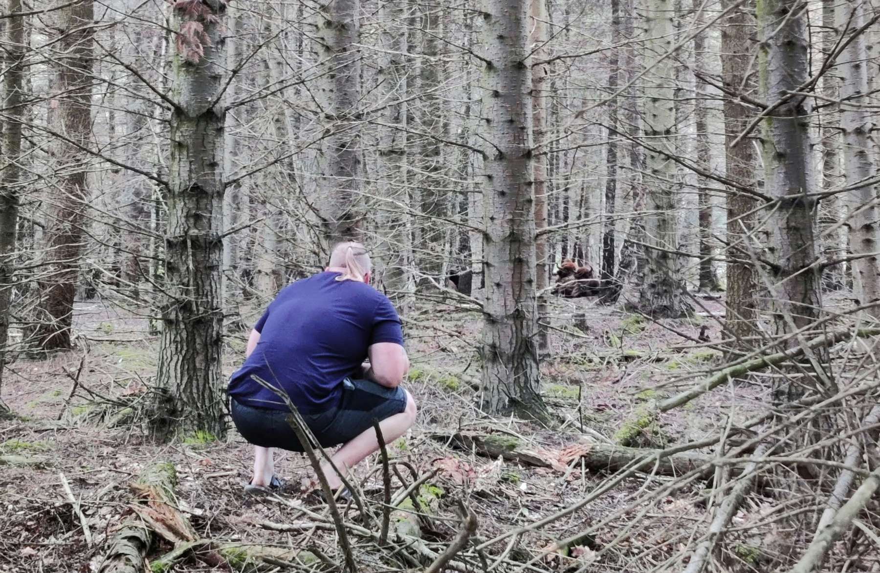 Pernille Ravnsbæk kom tæt på nogle af bisonerne på Bornholm. Her ses hendes svoger, der tager sig et ekstra godt kig på de store klovdyr.