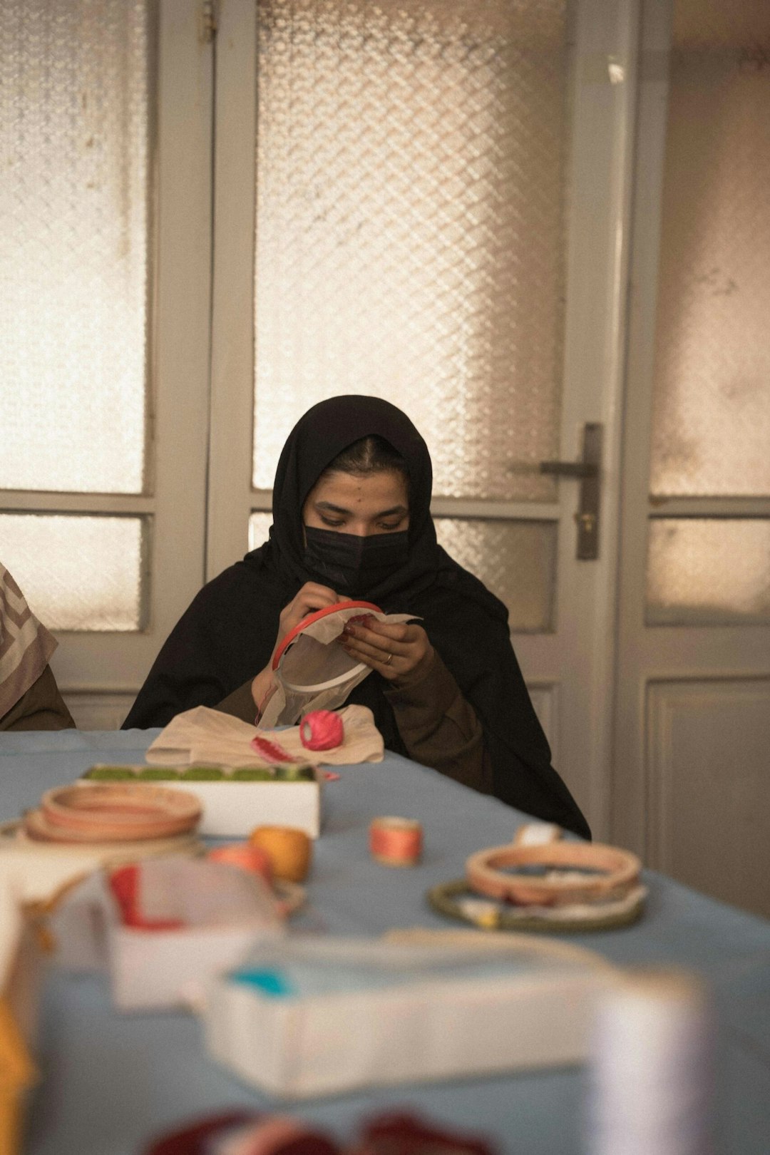 ”Én af de ting, kvinder er tilladt at arbejde med, er håndarbejde. Vi kan ikke have andre jobs, butikker eller virksomheder. Det er ikke tilladt for afghanske kvinder, men vi kan gøre det her,” siger hun gennem en tolk, der sidder ved siden af hende og oversætter til engelsk.
