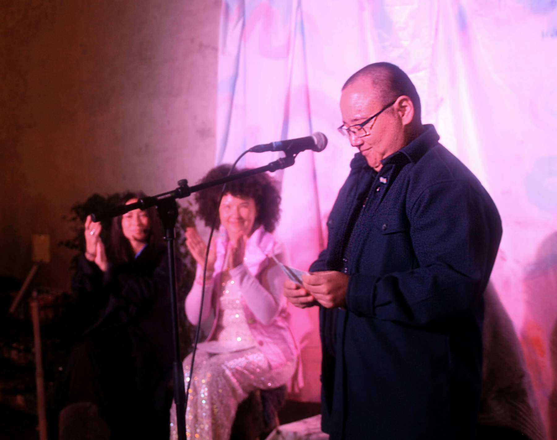 Da aftenen går på hæld i Det Grønlandske Hus, står de unge forfattere skulder ved skulder på scenen.
