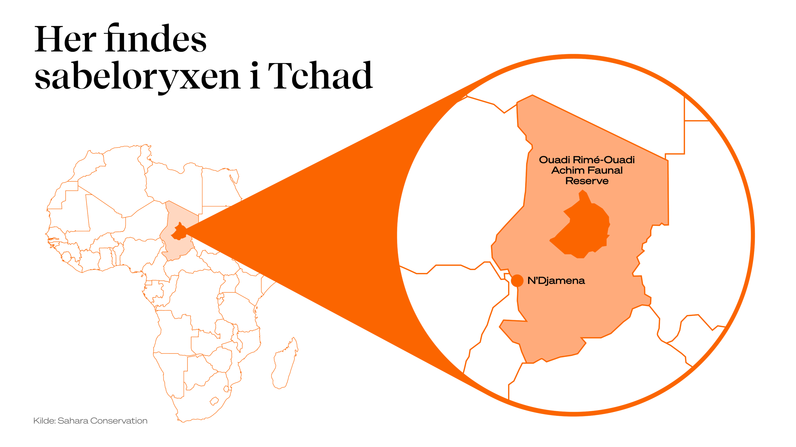 På kortet ses, hvor stor en del af Tchad, som Oudi Rimé-Ouadi Achim-reservatet dækker. Reservatet har fået sit navn fra to wadier, som er udtørrede flodlejer, der kun fyldes med vand i regntiden - nemlig Ouadi Rimé i syd og Ouadi Achim i nord. Grafik: Teo Olsen