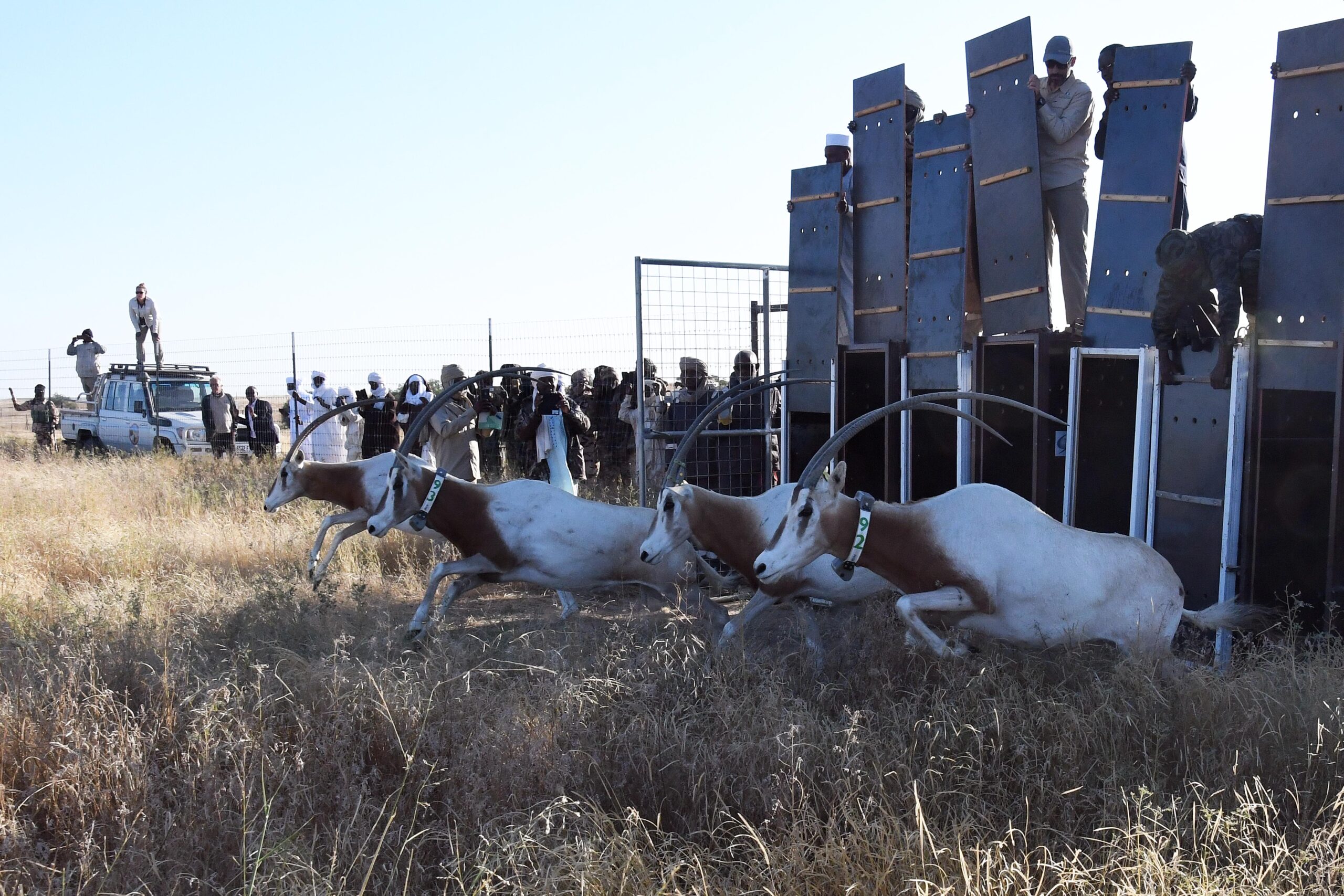 En gruppe af sabeloryxer lukkes ud til stor begrejstring fra de fremmødte. Nogle af oryxerne bærer allerede det halsbånd, som overvåger dem i det store reservat. Foto: Sahara Conservation